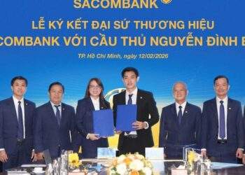 Cầu thủ Nguyễn Đình Bắc (phải) và bà Nguyễn Thị Kiều Anh (trái) - Phó Tổng giám đốc SACOMBANK thực ...