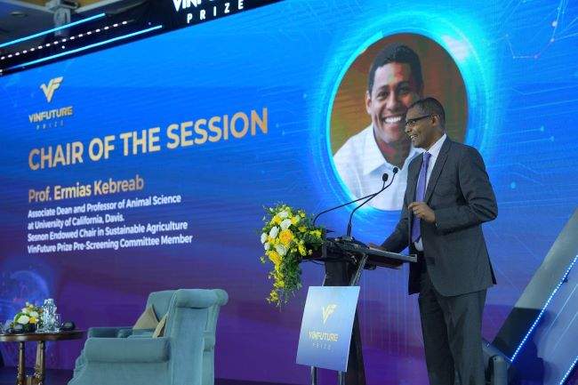 GS. Ermias Kebreab trình bày tại Tọa đàm Khoa học vì cuộc sống thuộc Tuần lễ Khoa học Công nghệ VinFuture. Ảnh: VFP