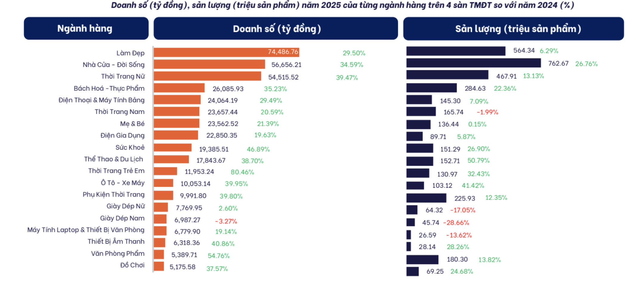 Các ngành hàng Làm đẹp (74,4 nghìn tỷ đồng), Nhà cửa – Đời sống (56,6 nghìn tỷ đồng) và Thời trang nữ (54,5 nghìn tỷ đồng) tiếp tục dẫn đầu về quy mô doanh số. Trong khi đó, các nhóm Sức khỏe (+46,89%), Thời trang trẻ em (+80,46%) và Văn phòng phẩm (+54,76%) ghi nhận tốc độ tăng trưởng vượt trội, trở thành điểm sáng trong cơ cấu ngành hàng.