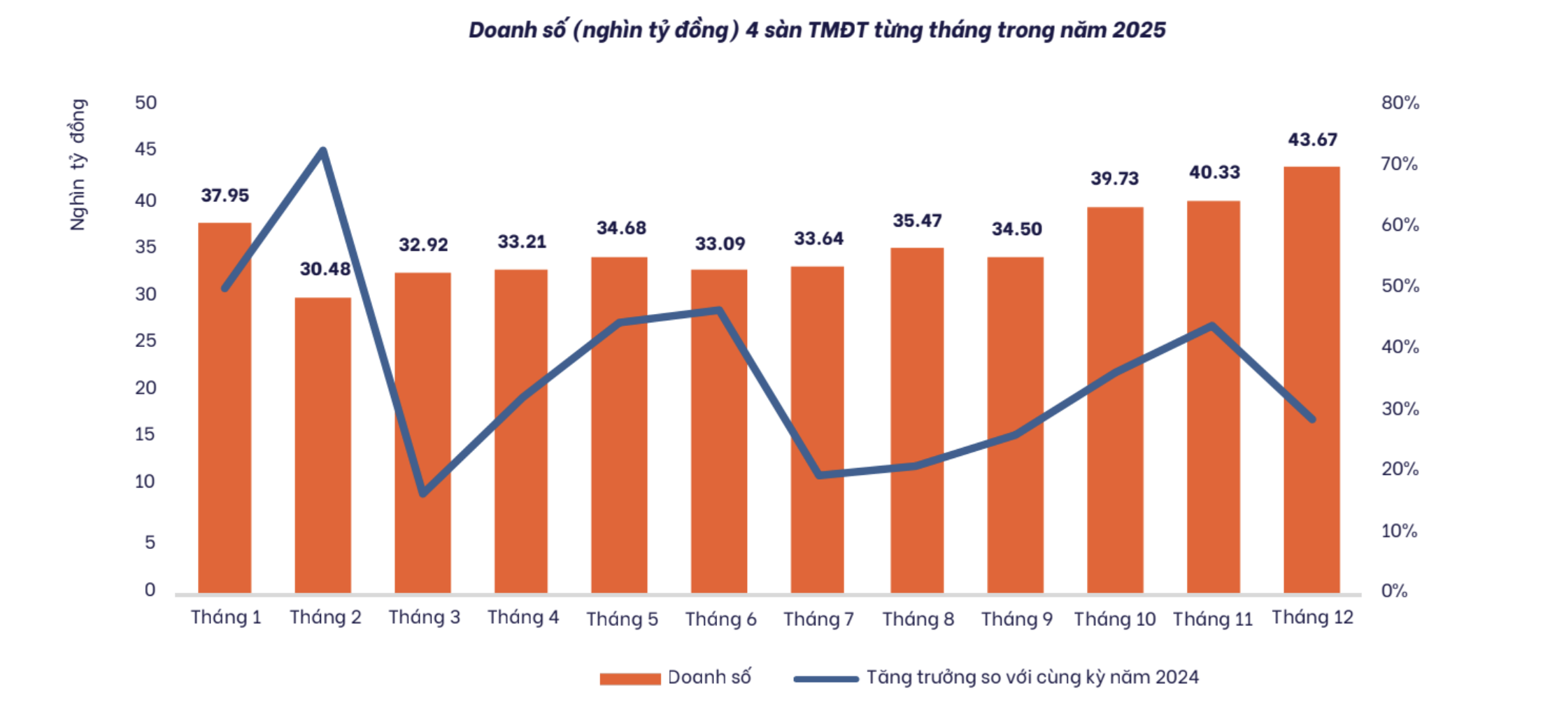 Riêng quý 4/2025 ghi nhận doanh số 123,73 nghìn tỷ đồng, tăng 35,74% so với cùng kỳ và tăng 19,43% so với quý trước, trở thành giai đoạn đóng góp lớn nhất cho tăng trưởng cả năm. Các tháng 10, 11 và 12 lần lượt đạt 39,73 nghìn tỷ đồng, 40,33 nghìn tỷ đồng và 43,67 nghìn tỷ đồng, phản ánh xu hướng mua sắm trực tuyến đạt đỉnh vào cuối năm.