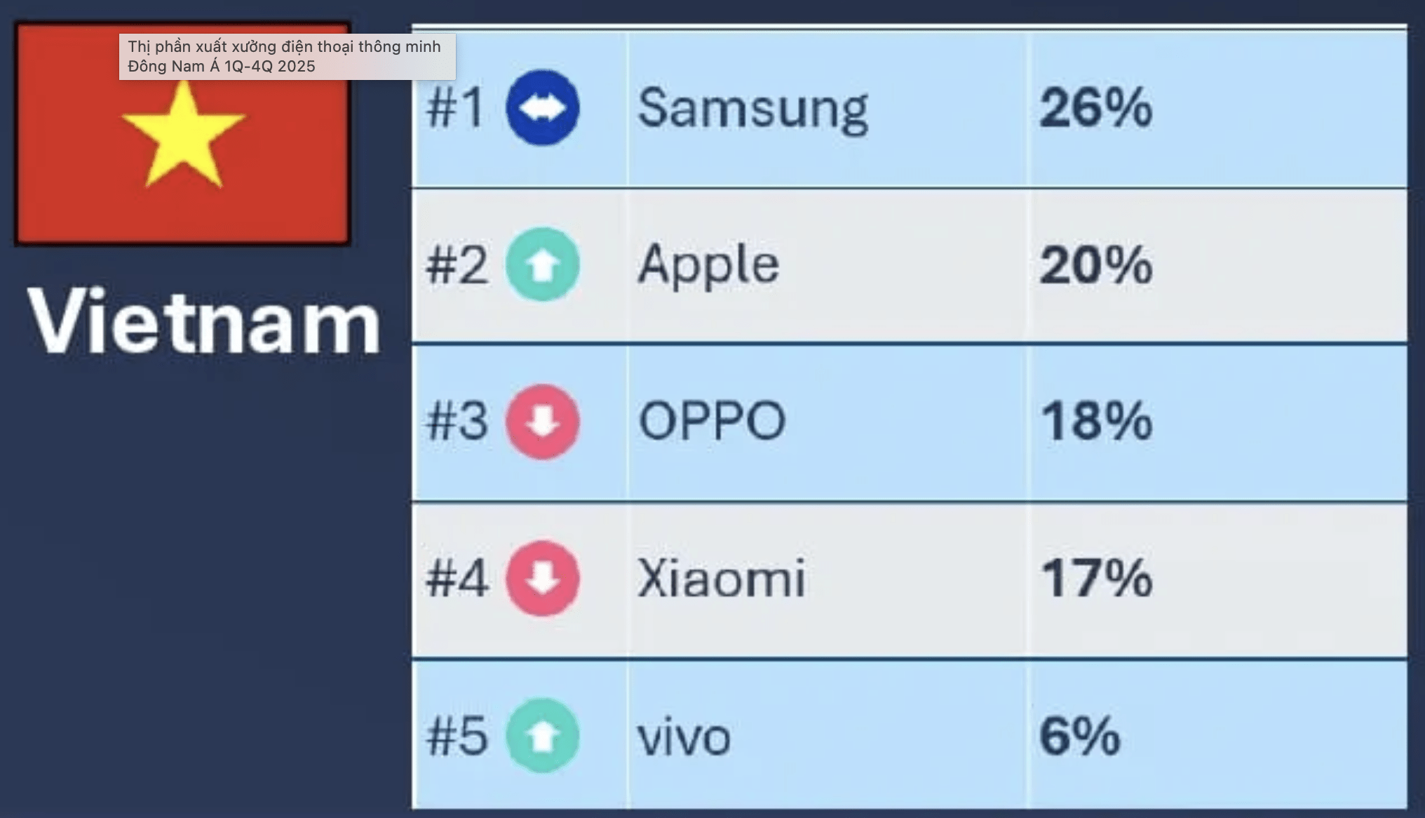 Samsung dẫn đầu thị trường smartphone Đông Nam Á trong cả năm 2025 với doanh số tăng 5%, đạt 17,9 triệu máy, qua đó nâng thị phần lên 18%. Riêng quý 4/2025, hãng xuất xưởng 4,2 triệu thiết bị, chiếm 17% thị phần, tăng 19% so với cùng kỳ năm trước.