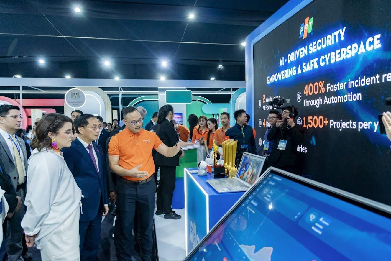 Tại Triển lãm công nghệ trong khuôn khổ Lễ mở ký Công ước Hà Nội, FPT giới thiệu các giải pháp bảo mật ứng dụng AI đã được giải thưởng tại khu vực, góp phần cùng quốc gia, tổ chức, doanh nghiệp kiến tạo không gian mạng an toàn, tự chủ và bền vững.