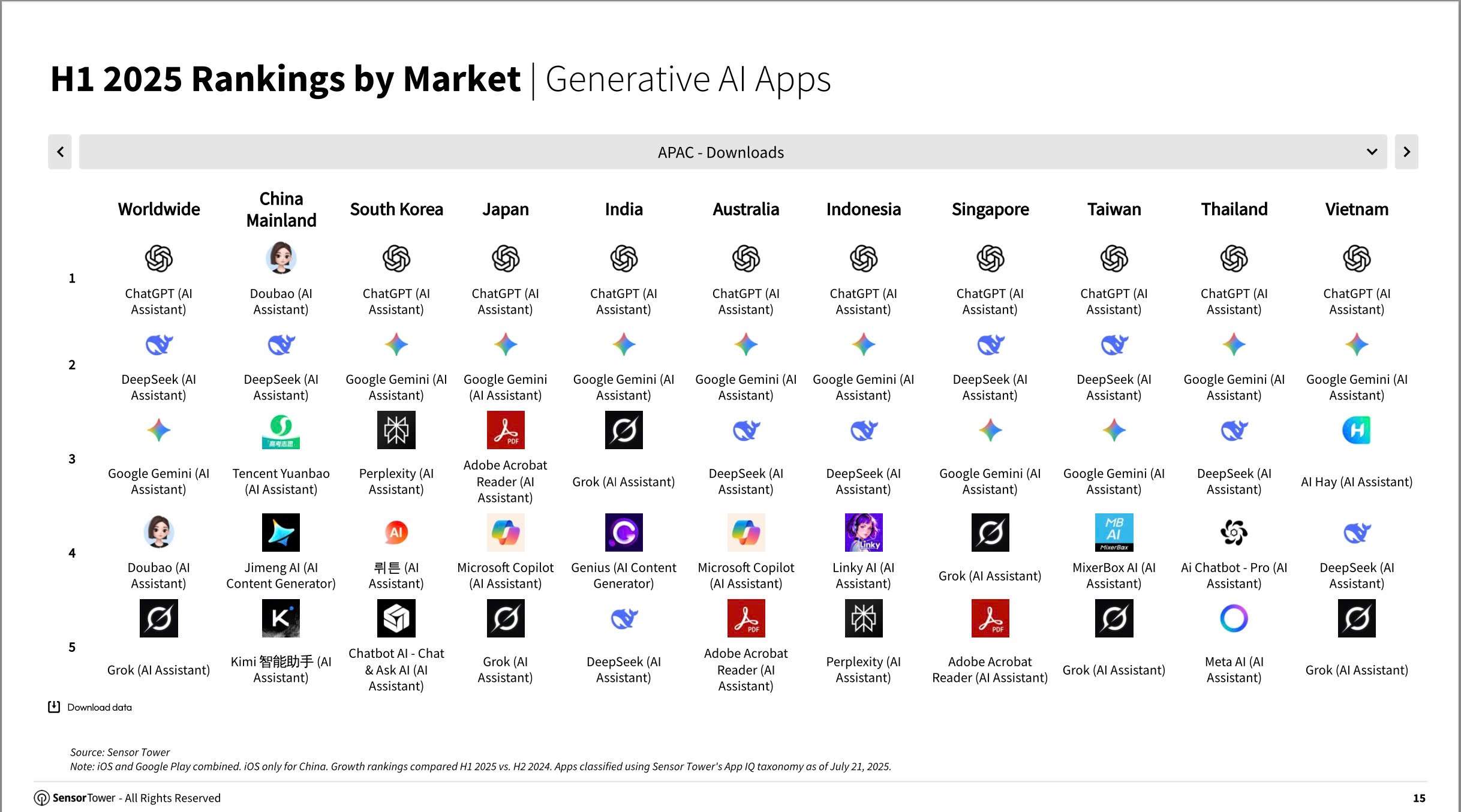 Tại châu Á, đặc biệt là Trung Quốc, sự trỗi dậy nhanh chóng của các ứng dụng nội địa đang tạo ra áp lực lớn cho ChatGPT. Tiêu biểu là ứng dụng tạo sinh DeepSeek, ra mắt từ tháng 1/2025, nhanh chóng trở thành ứng dụng có tốc độ tăng trưởng nhanh nhất khu vực châu Á, Trung Đông và châu Phi, thậm chí vượt ChatGPT về lượt tải chỉ sau vài tuần tại thị trường Trung Quốc.