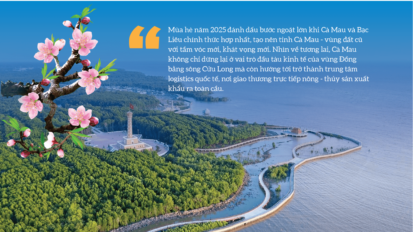 Từ vùng đất cuối trời Tổ quốc, Cà Mau không chỉ mở rộng địa giới, mà còn mở rộng tầm nhìn, mở ra những cơ hội mới về kinh tế, văn hóa, du lịch và giao thương. Mỗi con đường, mỗi cây cầu, mỗi cảng biển đang dần hiện thực hóa giấc mơ kết nối vững chắc giữa đất liền và biển cả, biến nơi cực Nam ấy giàu sức sống, giàu bản sắc và giàu tiềm năng phát triển…