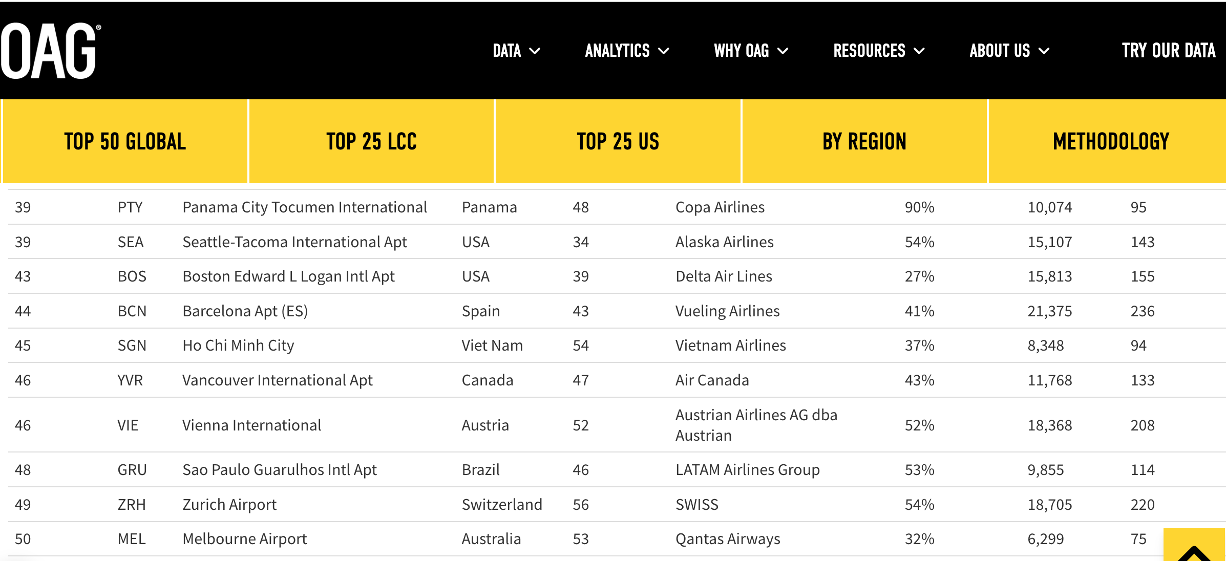 OAG cũng công bố bảng xếp hạng top 25 sân bay có mức độ kết nối cao nhất thế giới dành cho các hãng hàng không chi phí thấp (Airport Megahubs) năm 2025. Theo đó, Việt Nam có hai sân bay góp mặt trong danh sách này, gồm Cảng hàng không quốc tế Tân Sơn Nhất, xếp thứ 19, và Cảng hàng không quốc tế Nội Bài, xếp thứ 25.