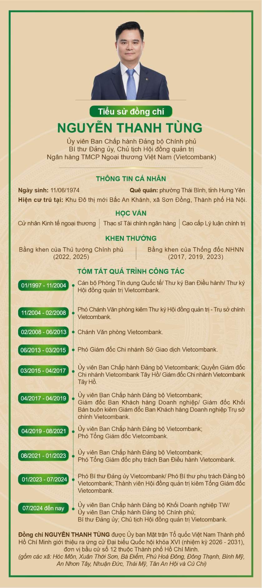 Ngày 21/3/2026, Hội đồng Bầu cử quốc gia đã công bố danh sách những người trúng cử đại biểu Quốc hội khóa XVI, trong đó có ông Nguyễn Thanh Tùng – Uỷ viên Ban Chấp hành Đảng bộ Chính phủ, Bí thư Đảng ủy, Chủ tịch Hội đồng quản trị Vietcombank. Sự kiện này không chỉ đánh dấu một bước ngoặt trong sự nghiệp của ông Tùng mà còn thể hiện niềm tin của cử tri TP. Hồ Chí Minh đối với những người có năng lực và kinh nghiệm thực tiễn.