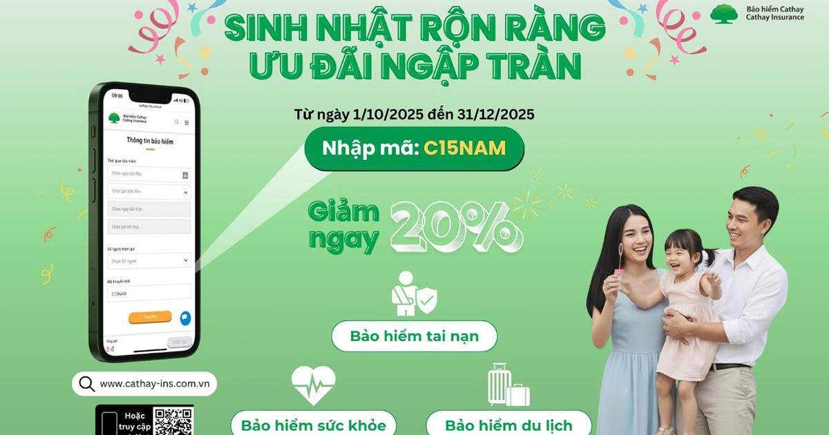Nhân dịp kỷ niệm 15 năm thành lập công ty, từ ngày 1.10.2025 đến hết ngày 31.12.2025, Bảo hiểm Cathay Việt Nam triển khai ưu đãi giảm giá 20% cho tất cả các sản phẩm bảo hiểm (trừ bảo hiểm xe máy và ô tô) khi mua trực tuyến tại Website chính thức của Cathay theo đường link https://www.cathay-ins.com.vn.