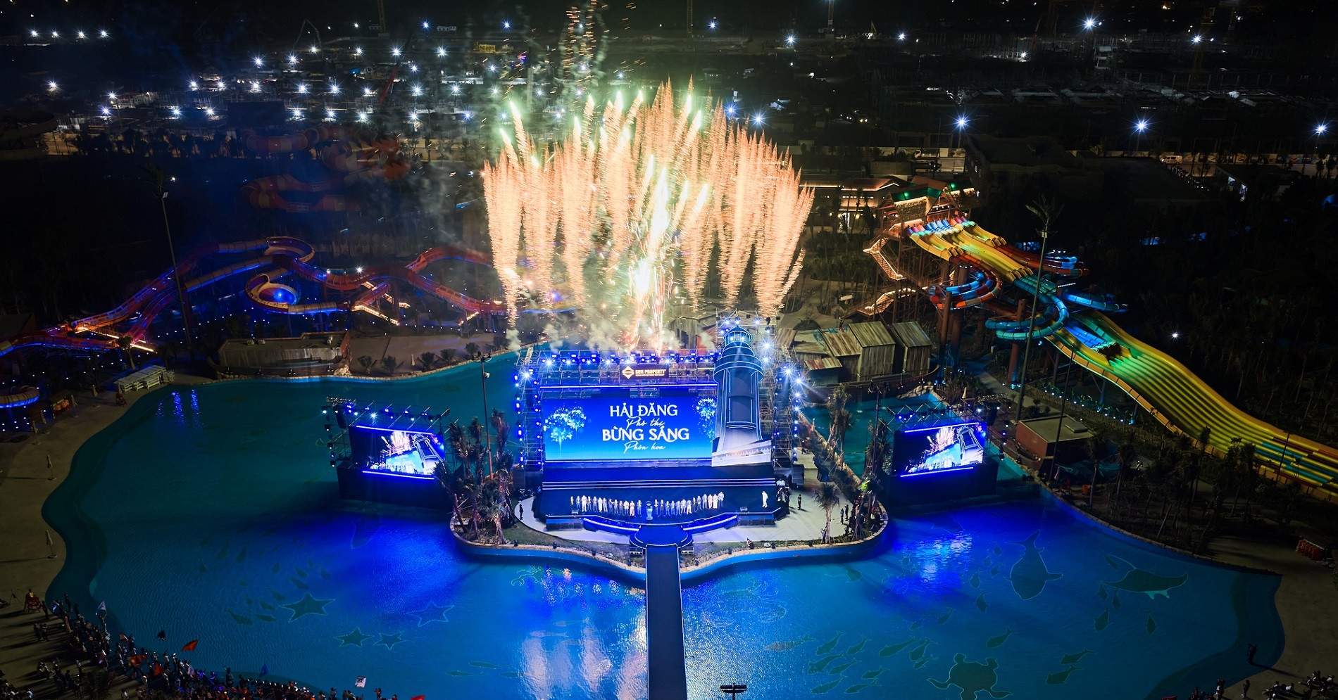Mở đầu sự kiện là màn “lighting show” kết hợp với hiệu ứng waterbomb, múa trống led hoành tráng. Kế tiếp, sau màn biểu diễn bùng nổ của giọng ca nội lực Lâm Bảo Ngọc, sân khấu tạm lắng lại. Ánh sáng màn led tắt nhường chỗ cho ánh sáng của ngọn hải đăng khổng lồ. Từng đợt sáng quét qua hé hộ các điểm nhấn Beacon Tower.