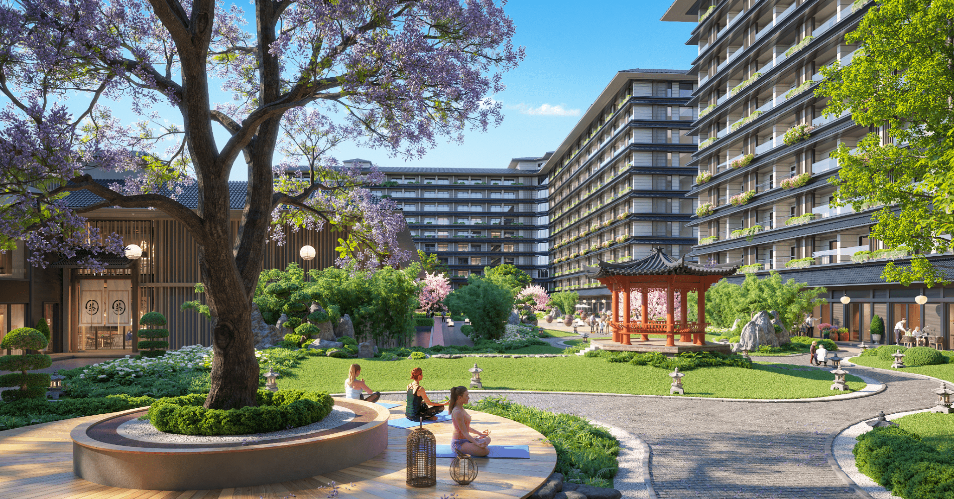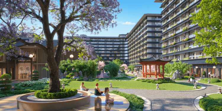Trong đó, hơn 30% diện tích dự án được dành cho cảnh quan xanh, kết hợp cùng công viên khoáng nóng Sora Onsen Park, tổ hợp trị liệu và nghỉ dưỡng cao cấp Thera Retreat & Spa, các khu xông hơi đa tầng, vườn thiền 5 giác quan trong kiến trúc mang cảm hứng xứ Mặt trời mọc. Đây là nền tảng cho các hoạt động phục hồi thể chất và tinh thần – yếu tố ngày càng được coi trọng trong bối cảnh nhu cầu chăm sóc sức khỏe gia tăng.