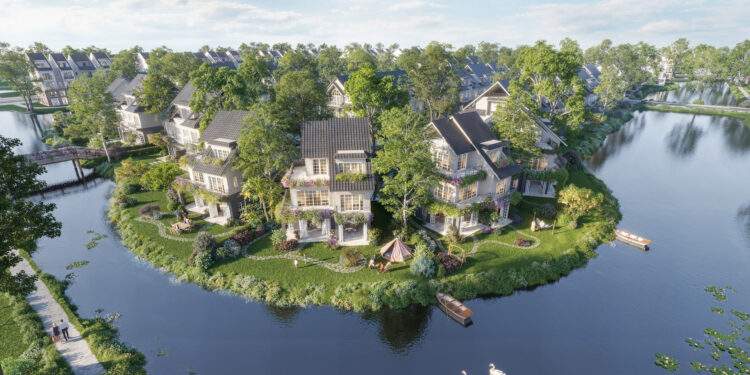Tại Eco Central Park (rộng gần 200ha, phường Trường Vinh, tỉnh Nghệ An), đại đô thị xanh lớn nhất miền Trung, dành giải thưởng “Dự án khu đô thị ven sông xuất sắc nhất”, nhà sáng lập Ecopark vừa mắt phân khu biệt thự đảo Central Island ở vị trí trung tâm dự án.
