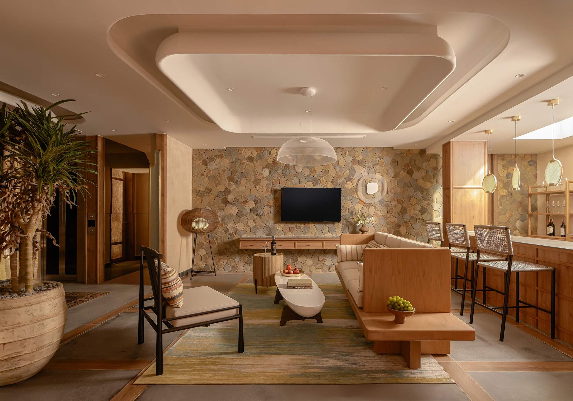 Trở về nhà, họ quyết định thiết kế tầng hầm thành một nơi giống như sảnh Nobu, để tạo ra một nơi ẩn náu tinh tế nhưng vẫn thoải mái cho gia đình.