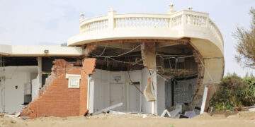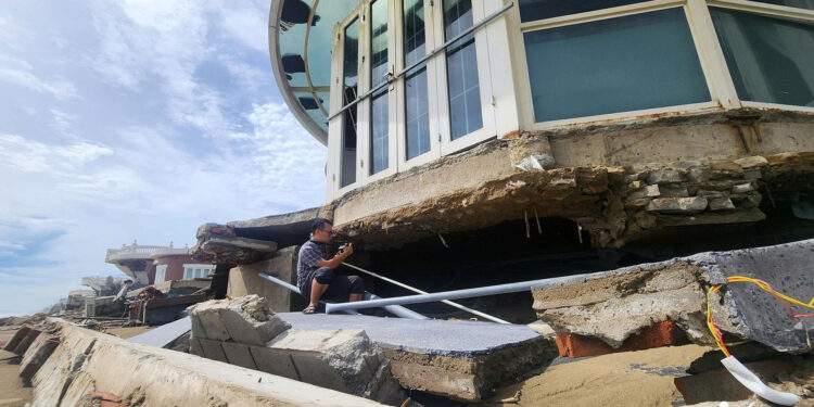 Sau bão số 10, hàng loạt căn biệt thự nằm sát biển Xuân Thành, Hà Tĩnh bị bão vò nát, lộ ra kết cấu móng khá đơn giản.