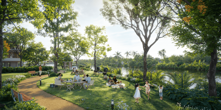 Bên trong phân khu, hệ tiện ích được thiết kế đa lớp, chăm sóc trọn vẹn nhu cầu từng thế hệ: người lớn tuổi thư thái tại vườn thiền, công viên ven kênh hay sân cộng đồng; người trẻ tận hưởng clubhouse, hồ bơi, gym‑yoga ngoài trời và coworking; trẻ nhỏ vui chơi tại sân đa năng, góc trò chơi dân gian và sân vận động liên hoàn.