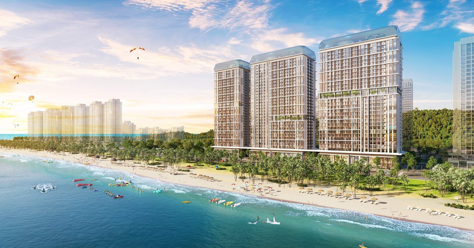 Trong khi đó, không gian riêng tư của mỗi căn hộ với ban công rộng và cửa kính lớn giúp cư dân có thể đón trọn làn gió biển, nhâm nhi ly cocktail trong ánh hoàng hôn, để tâm hồn lắng lại giữa khoảng trời riêng bình yên.