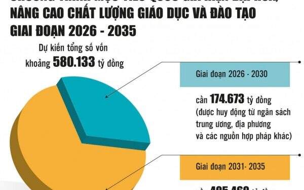 Với mục tiêu lớn và đối tượng thụ hưởng rộng, Bộ Giáo dục và Đào tạo dự kiến tổng số vốn để thực hiện chương trình vào khoảng 580.133 tỷ đồng. Nguồn vốn này được phân bổ cho 2 giai đoạn. Giai đoạn 2026 – 2030 cần 174.673 tỷ đồng được huy động từ ngân sách trung ương, địa phương và các nguồn hợp pháp khác; giai đoạn 2031 – 2035 cần 405.460 tỷ đồng.