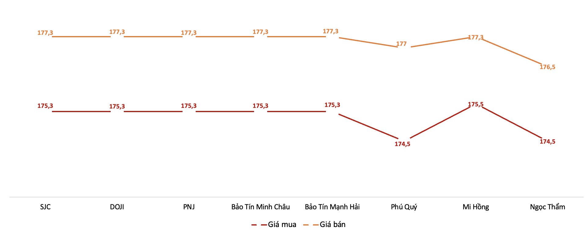 niêm yết ở mức 170,5 triệu – 174,5 triệu đồng/lượng. Chênh lệch giá
