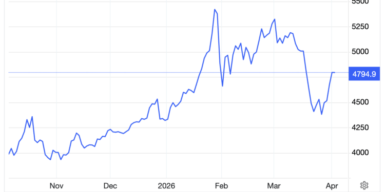 Lúc đóng cửa phiên giao dịch tại New York, giá vàng giao ngay đạt 4.759,5 USD/oz, tăng 89,7 USD/oz so với mức chốt của phiên trước, tương đương tăng hơn 1,9% – theo dữ liệu từ sàn giao dịch Kitco.