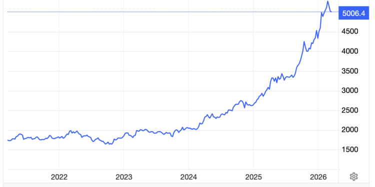 Trên sàn giao dịch hàng hóa tương lai COMEX, giá vàng giao tháng 4/2026 giảm 1,2%, đóng cửa ở mức 5.002,2 USD/oz.