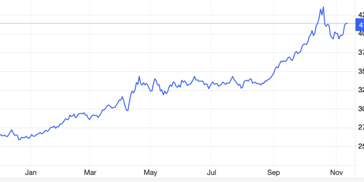 Lúc đóng cửa tại thị trường New York, giá vàng giao ngay tăng 11 USD/oz, tương đương tăng 0,27%, đạt 4.127,9 USD/oz – theo dữ liệu từ sàn giao dịch Kitco. Trong phiên, có lúc giá vàng giao ngay đạt mức cao nhất kể từ ngày 23/10.
