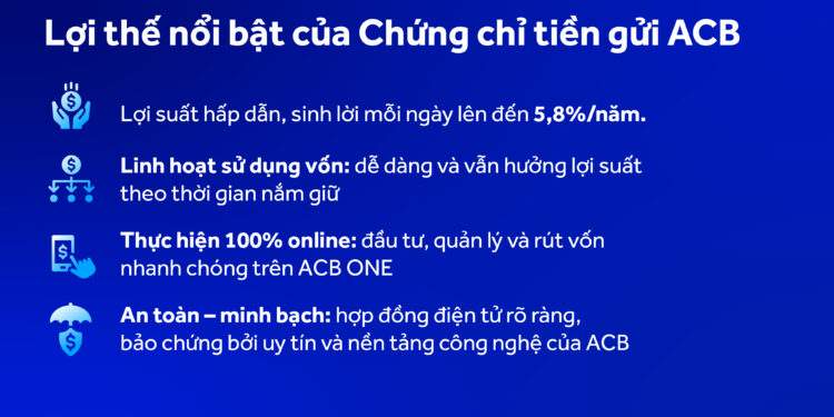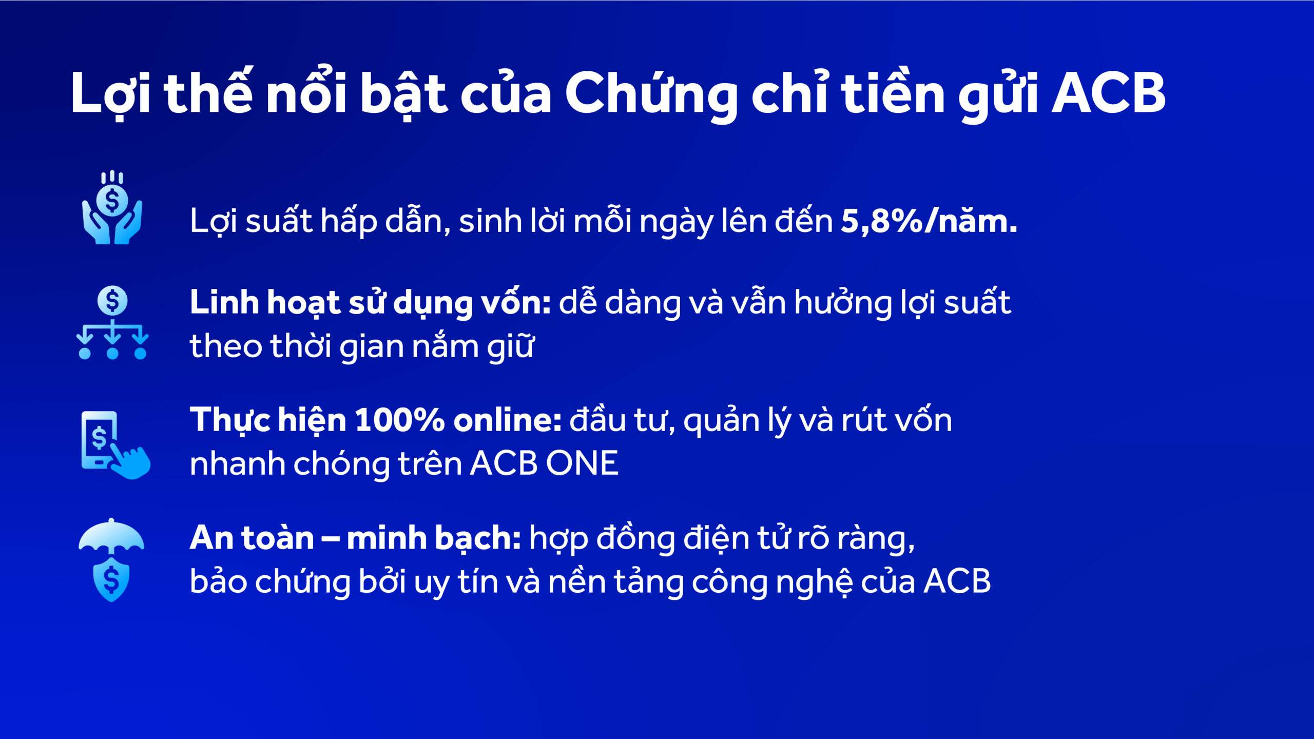 Được biết, lợi thế nổi bật của Chứng chỉ tiền gửi ACB là lợi suất hấp dẫn, sinh lời mỗi ngày lên đến 5,8%/năm; Linh hoạt sử dụng vốn: dễ dàng và vẫn hưởng lợi suất theo thời gian nắm giữ; Thực hiện 100% online: đầu tư, quản lý và rút vốn nhanh chóng trên ACB ONE; An toàn – minh bạch: Hợp đồng điện tử rõ ràng, bảo chứng bởi uy tín và nền tảng công nghệ của ACB.