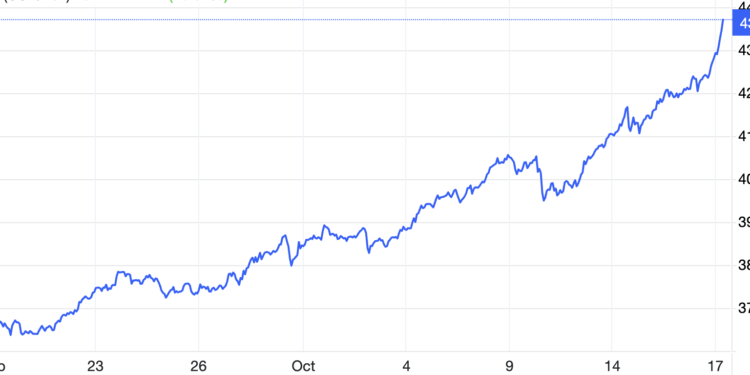Sau khi tăng hơn 100 USD/oz để vượt qua mốc 4.300 USD/oz trong phiên giao dịch ngày thứ Năm (16/10), giá vàng thế giới tiếp tục bứt phá vào đầu giờ sáng nay (17/10), tiến tới mốc chẵn tiếp theo…