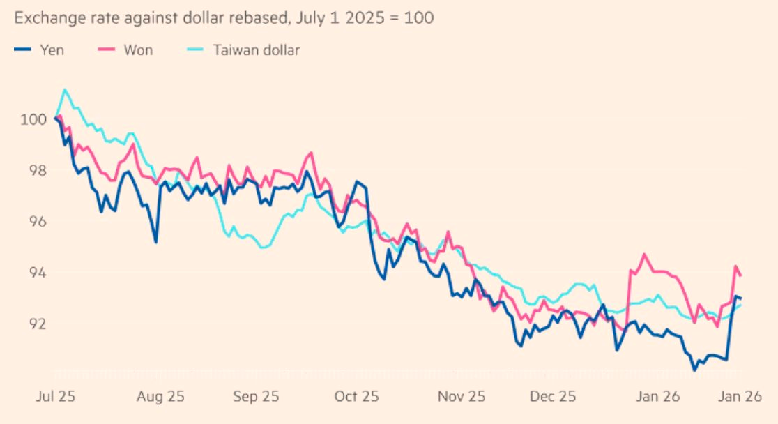 Tính đến đầu năm 2026, đồng yên Nhật và đồng won Hàn Quốc vẫn neo ở mức thấp nhất trong nhiều thập kỷ, trong khi đồng Tân Đài tệ của Đài Loan (Trung Quốc) đã mất phần lớn đà tăng giá đạt được hồi tháng 5 năm ngoái.