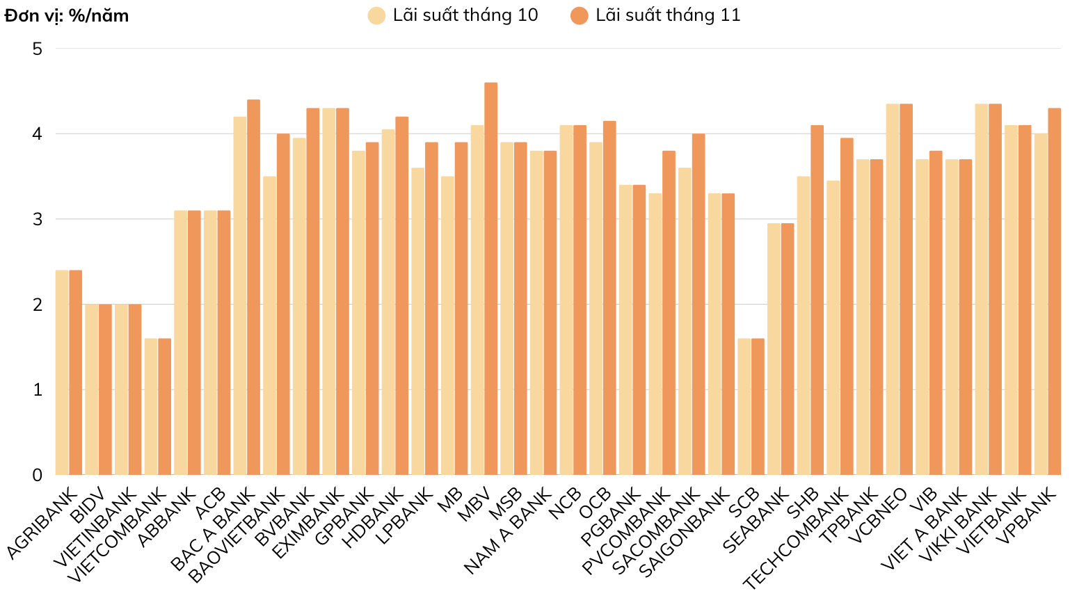 Nhìn chung, nhóm ngân hàng thương mại do Nhà nước chi phối vốn hiện là nhóm trả lãi suất tiết kiệm thấp nhất trên thị trường: 1,6–2,4%/năm (kỳ hạn 1 tháng) và 1,9-3%/năm (kỳ hạn 3 tháng). Nhóm ngân hàng thương mại lớn (VPBank, MBBank, ACB) dao động 3,5–4,4%/năm, trong khi nhóm ngân hàng nhỏ và vừa dao động từ 3,6% đến hơn 4,5%.