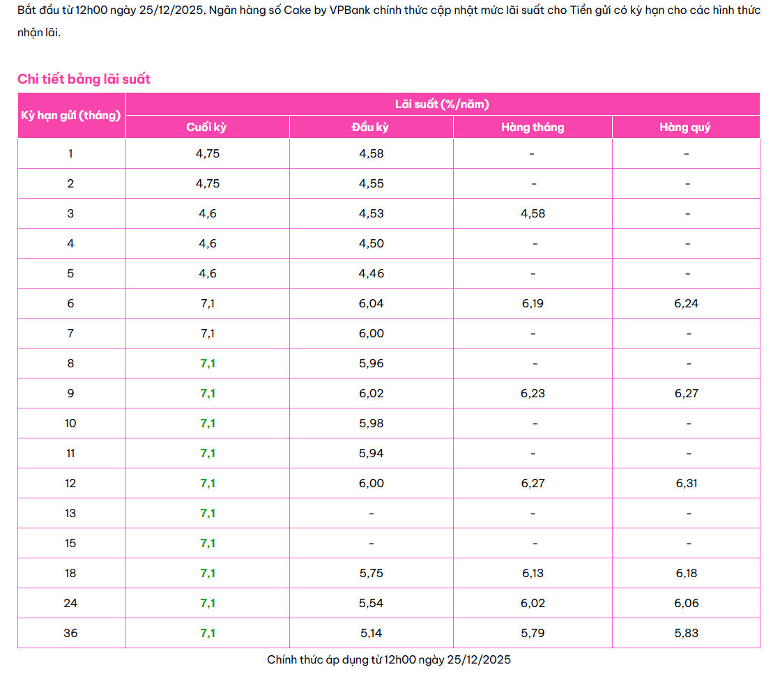 Theo thông tin từ Cake by VPBank, trong thời gian 25/12 – 31/12, ngân hàng này áp dụng cơ chế cộng trực tiếp lãi suất ưu đãi vào mức lãi suất niêm yết khi khách hàng mở mới tài khoản tiền gửi có kỳ hạn thông qua ứng dụng CAKE BANK. Riêng với kỳ hạn 6 tháng, mức lãi suất được cộng thêm tăng dần theo quy mô khoản tiền gửi, dao động từ 0,2%/năm đến tối đa 1%/năm.