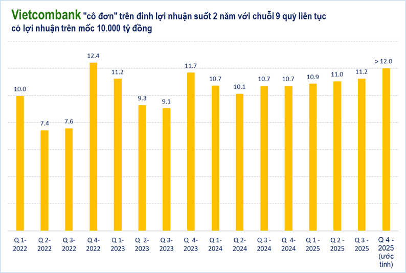 Suốt nhiều năm, Vietcombank vẫn được xem là “ngôi sao cô đơn” trên đỉnh lợi nhuận của ngành ngân hàng. Tính đến nay, ngân hàng này đã có 11 quý ghi nhận lợi nhuận trên 10.000 tỷ đồng, trong đó nổi bật là chuỗi liên tiếp từ quý IV/2023 đến nay, chưa từng rời khỏi mốc này.