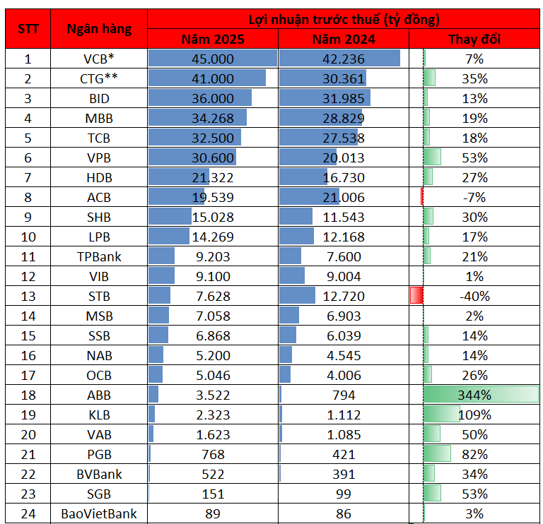 Theo thông tin tại Hội nghị tổng kết công tác Đảng và hoạt động kinh doanh năm 2025, lãnh đạo Vietcombank cho biết lợi nhuận trước thuế năm 2025 của ngân hàng tăng hơn 7% so với năm 2024 và theo phê duyệt của Ngân hàng Nhà nước. Với lợi nhuận hợp nhất trước thuế năm 2024 đạt hơn 42.200 tỷ đồng, ước tính mức lãi năm 2025 của Vietcombank đạt trên 45.000 tỷ đồng – mức cao nhất lịch sử.