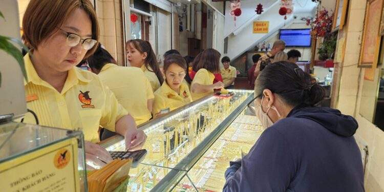 Quy đổi theo tỉ giá niêm yết, giá vàng thế giới hiện tương đương khoảng 145,8 triệu đồng/lượng, thấp hơn đáng kể so với giá vàng trong nước.