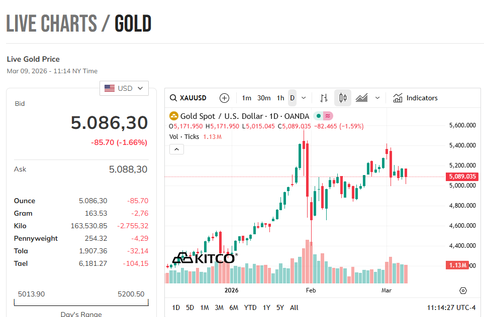 Giá vàng thế giới giao ngay ghi nhận lúc 21h55 (giờ Việt Nam) giảm gần 86 USD, tương đương 1,66% so với mức đóng cửa tuần trước, xuống còn 5.086 USD/ounce.