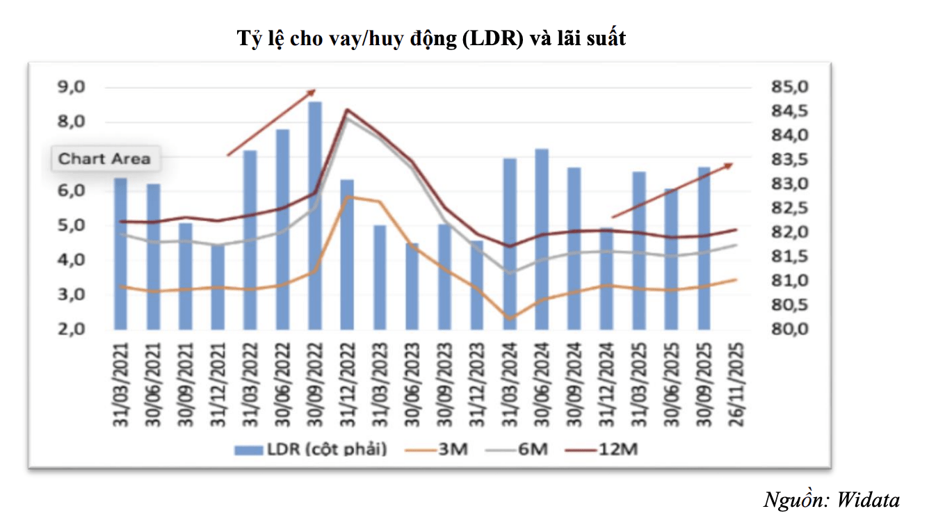 cho thấy mức độ căng thẳng ngày càng rõ rệt. Hệ số LDR (cho vay/huy động) toàn