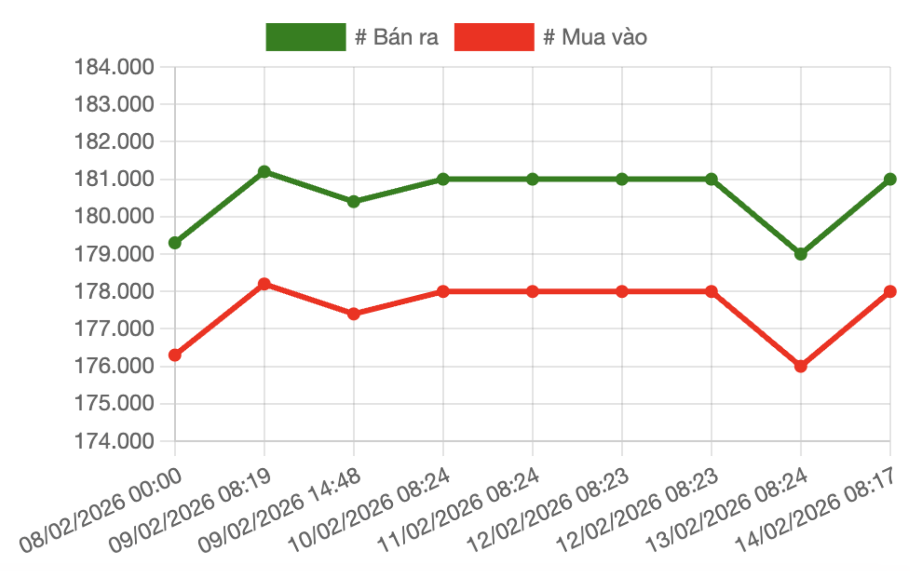 triệu đồng/lượng và giá bán ở mức 180,5 triệu đồng/lượng trong suốt phiên sáng. So với giá chốt phiên 13/2, giá giao