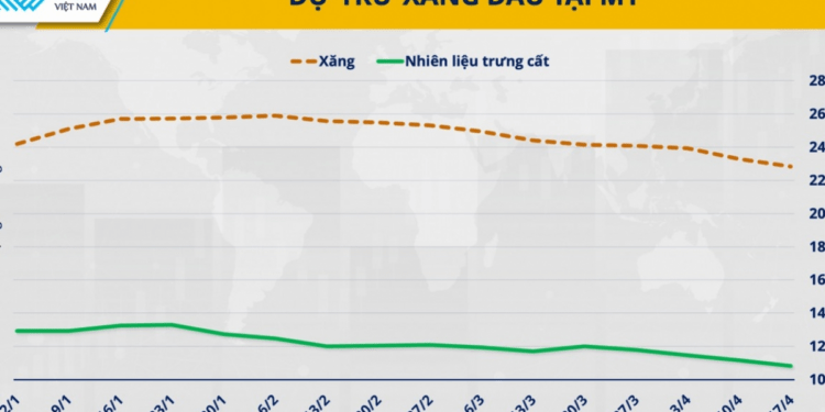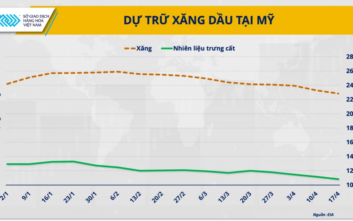 Bên cạnh yếu tố địa chính trị, dữ liệu từ Cơ quan Thông tin Năng lượng Mỹ (EIA) cũng góp phần củng cố đà tăng. Theo dữ liệu của EIA, trong tuần kết thúc ngày 17/4, tồn kho xăng của Mỹ giảm tuần thứ 10 liên tiếp xuống 4,57 triệu thùng; tồn kho nhiên liệu chưng cất giảm tuần thứ 4 liên tiếp, còn gần 3,43 triệu thùng – mức giảm sâu nhất kể từ đầu tháng 3.