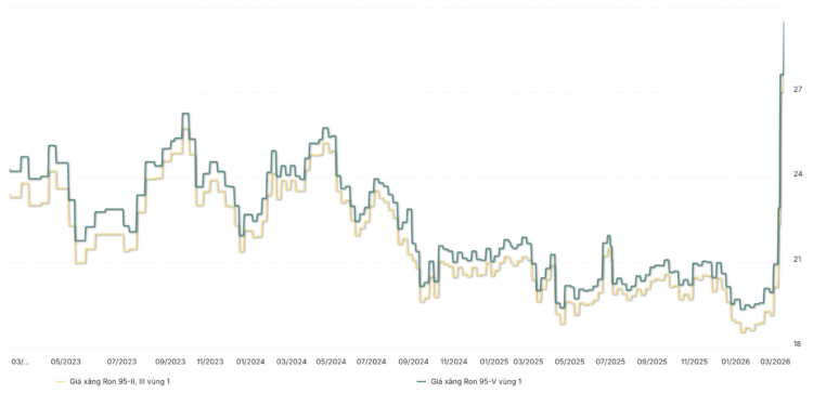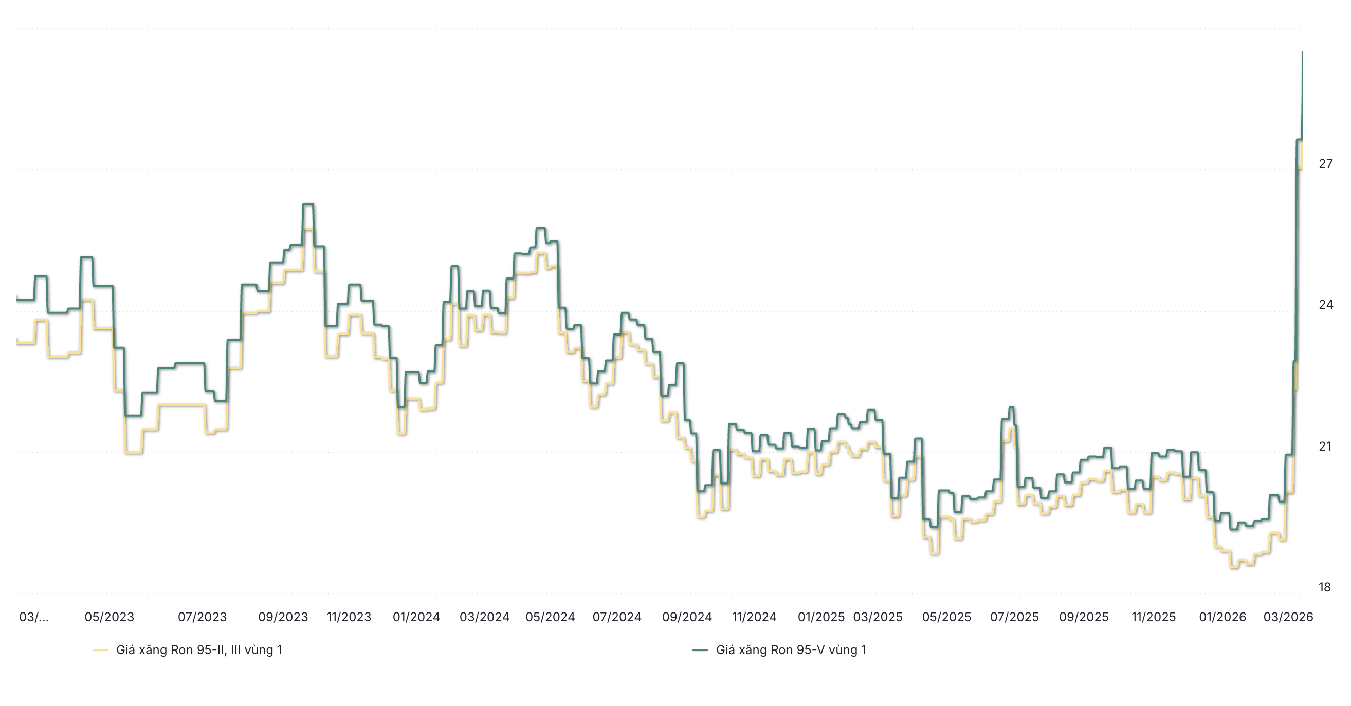 Theo dữ liệu thị trường, sau khi duy trì xu hướng giảm trong suốt năm 2025 và hai tháng đầu năm 2026, giá xăng RON95 đã bật tăng mạnh từ ngày 4/3/2026, với mức tăng hơn 30% so với cùng kỳ năm trước.