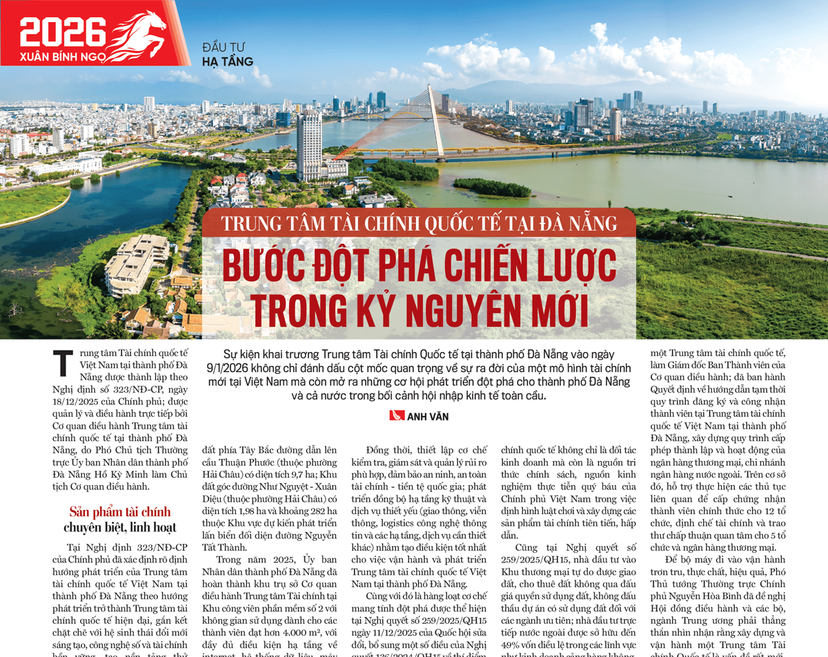 Trung tâm Tài chính Quốc tế tại Đà Nẵng đã chính thức khai trương vào ngày 9/1/2026, đánh dấu một bước ngoặt quan trọng trong việc phát triển mô hình tài chính mới tại Việt Nam. Sự kiện này không chỉ mở ra cơ hội phát triển đột phá cho thành phố Đà Nẵng mà còn cho cả nước trong bối cảnh hội nhập kinh tế toàn cầu. Trung tâm được thành lập theo Nghị định số 323/NĐ-CP của Chính phủ và được quản lý bởi Cơ quan điều hành Trung tâm Tài chính quốc tế tại Đà Nẵng, do Phó Chủ tịch Thường trực Ủy ban Nhân dân thành phố Đà Nẵng Hồ Kỳ Minh làm Chủ tịch.