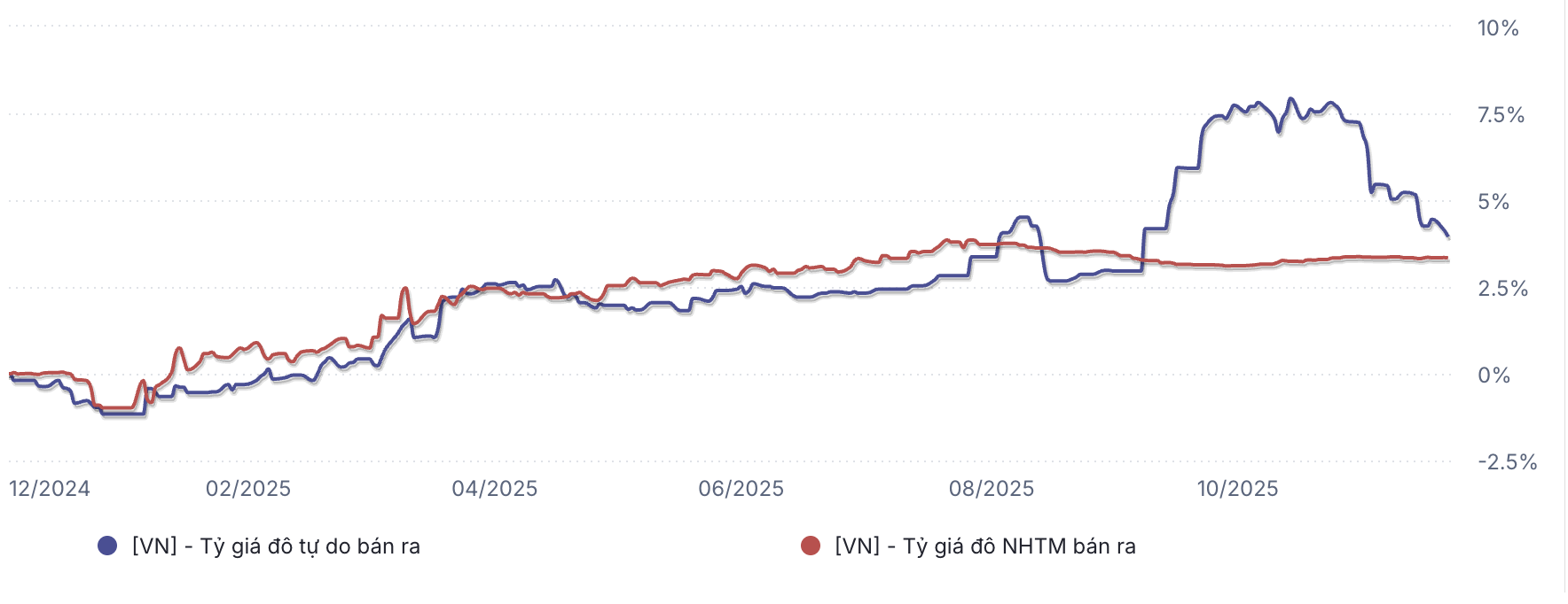 Đến cuối tháng 8/2025, tỷ giá chính thức đã tăng gần 4% so với đầu năm. Sau đó, nhờ các biện pháp can thiệp của Ngân hàng Nhà nước – bao gồm bán ngoại tệ kỳ hạn cho các ngân hàng có trạng thái ngoại tệ âm – nhu cầu ngoại tệ hợp pháp đã được đáp ứng, góp phần ổn định tỷ giá và giúp thị trường hạ nhiệt.
