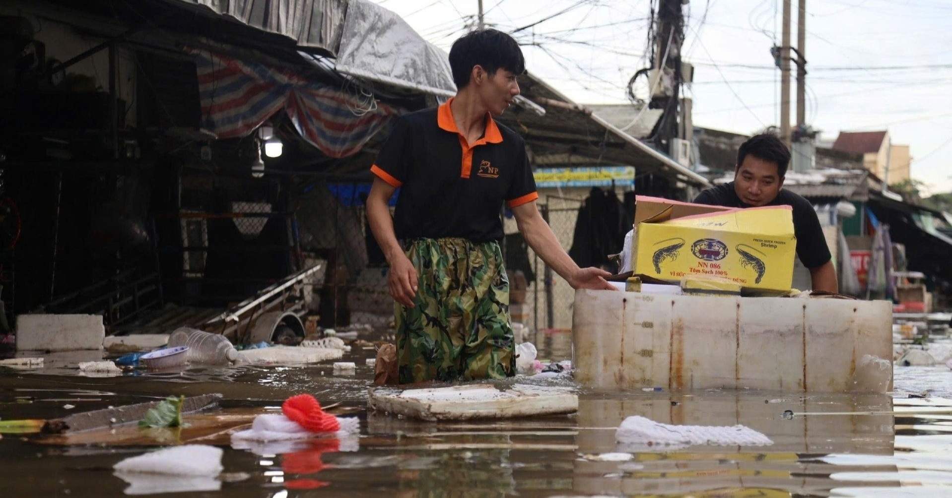 Việc buôn bán ở chợ đầu mối và khu vực phụ chợ Vinh bị gián đoạn do nước ngập sâu. Tiểu thương buộc phải lội nước để vớt vát tài sản, di dời hàng hóa.