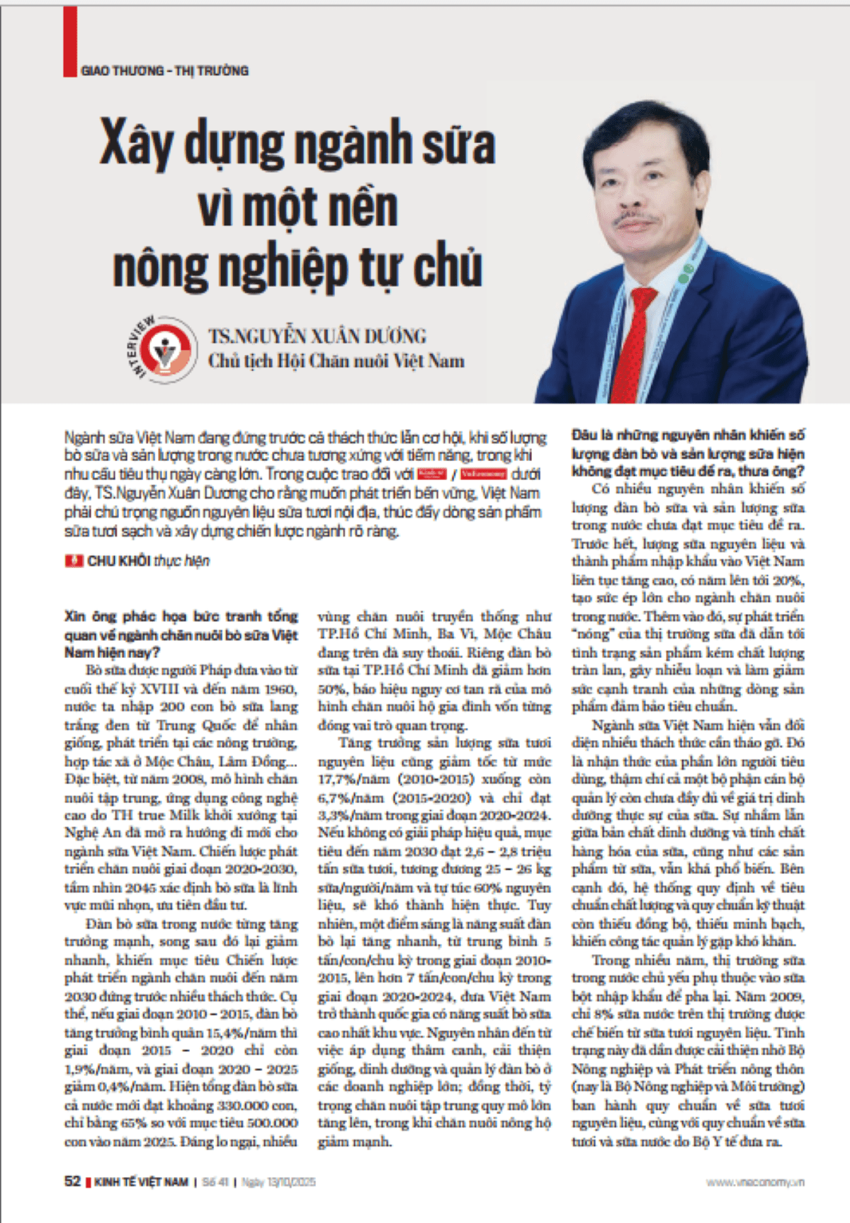 Trong cuộc trao đổi với Tạp chí Kinh tế Việt Nam/VnEconomy, TS Nguyễn Xuân Dương, Chủ tịch Hội Chăn nuôi Việt Nam, cho rằng muốn phát triển bền vững, Việt Nam phải chú trọng nguồn nguyên liệu sữa tươi nội địa, thúc đẩy dòng sản phẩm sữa tươi sạch và xây dựng chiến lược ngành rõ ràng.