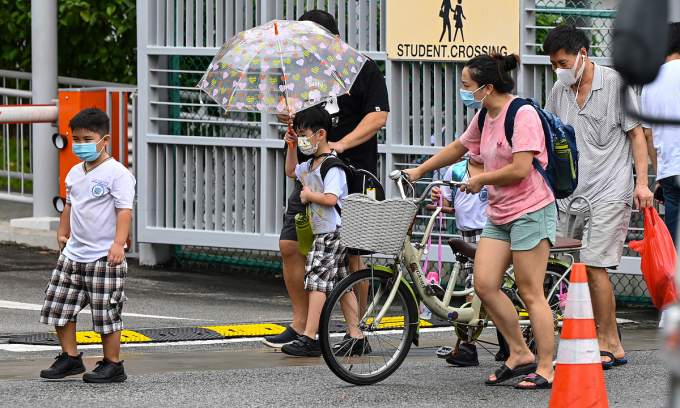 Children walk home with their guardians after school in Singapore in 2021. Photo by AFP |