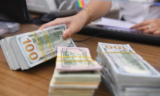 An employee counts U.S. banknotes at a bank in Hanoi. Photo by VnExpress/Giang Huy
