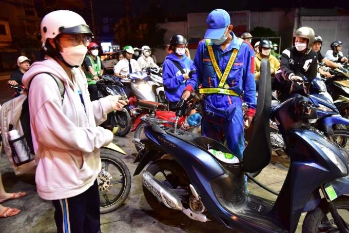 An employee refills a motorbike at a fuel station in HCMC in October 2022. Photo by VnExpress/Quynh Tran