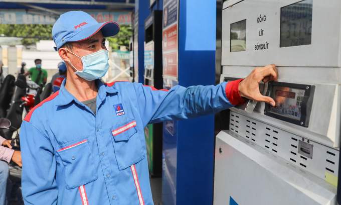An employee operates a gasoline dispenser at a fuel station in HCMC in 2022. Photo by VnExpress/Quynh Tran |
