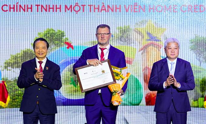 Jakub Kudrna (C), Chief Strategy Officer and Chairman of Home Credit Vietnam’s ESG Steering Group, receives the Top 10 Sustainable Companies in Trade and Services certification from Deputy Minister Nguyen Manh Khuong and VCCI Vice President Nguyen Quang Vinh. Photo courtesy of Home Credit |