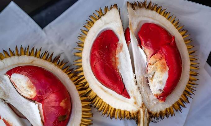 “The unique thing is that the Durian Merah fruit will not fall even when ripe. The big and tall trees must be climbed to pick the fruit,” he said, describing the bright red flesh as having a less pungent smell, a drier texture and a less sweet flavor profile compared to normal durians.