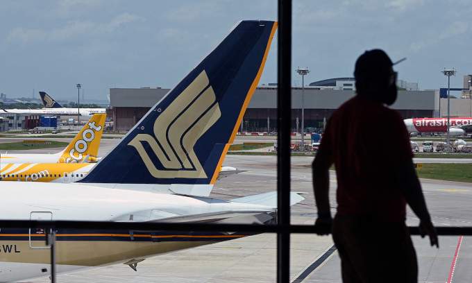 A Singapore Airlines plane is parked besides a Scoot passenger plane on the terminal tarmac at Singapore Changi Airport in Singapore on March 15, 2021. Photo by AFP |