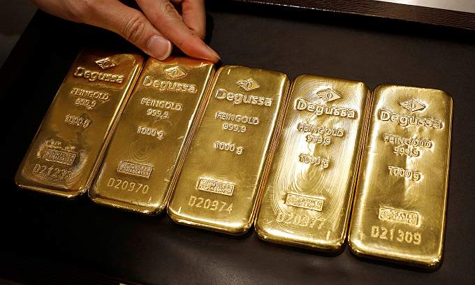 An employee shows gold bullion at Degussa shop in Singapore, June 16, 2017. Photo by Reuters