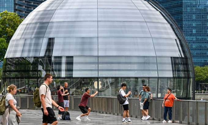 People take pictures on the boardwalk in front of the Apple Store at Marina Bay in Singapore on September 26, 2024. Photo by AFP |