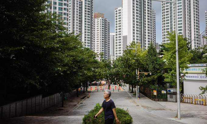 A man walks past blocks of residential buildings in Seoul on August 26, 2025. Photo by AFP |